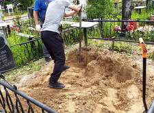 На этом участке мы работали с могилой, на которой сравнительно недавно произошло дозахоронение – земляной холм даже не успел как следует осесть и разойтись. На территории участка уже находился гранитный памятник специфической формы, копию которого нам и предстояло установить.